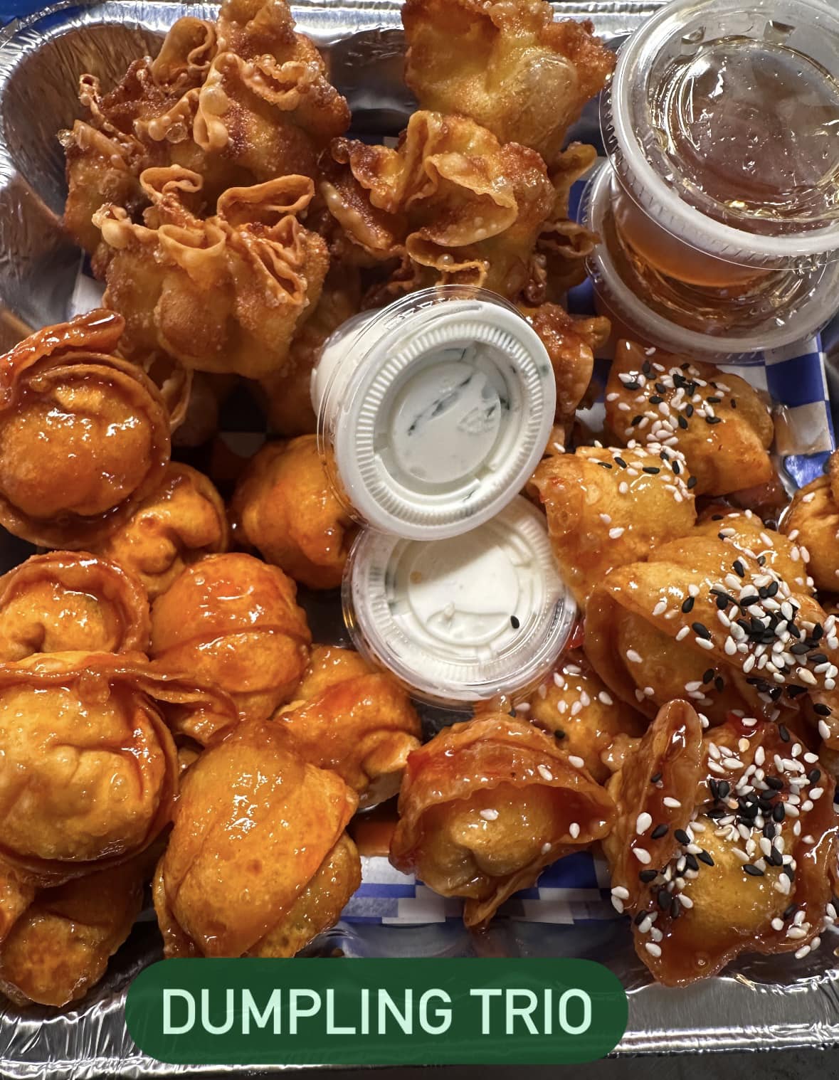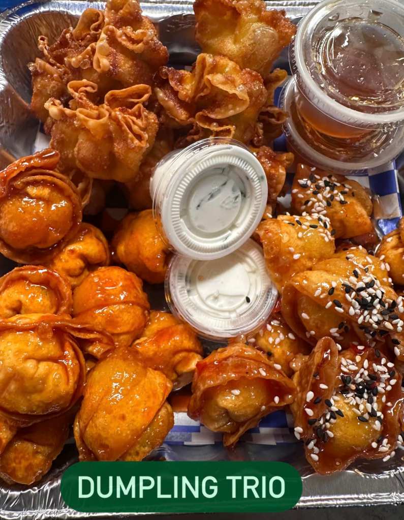 Choose 3 types of dumplings – sesame, fireballs, fried gyoza, steamed gyoza, steamed OG dumplings, fried OG dumplings