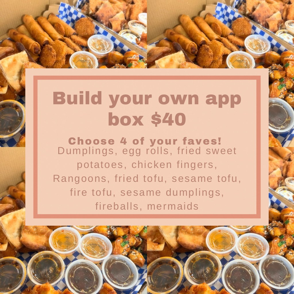 Full orders of: sweet potato, fried egg rolls, fresh rolls, edamame, scallion pancake, dumplings (steamed or fried), wok-tossed dumplings (choose sesame dumplings or fireballs) .