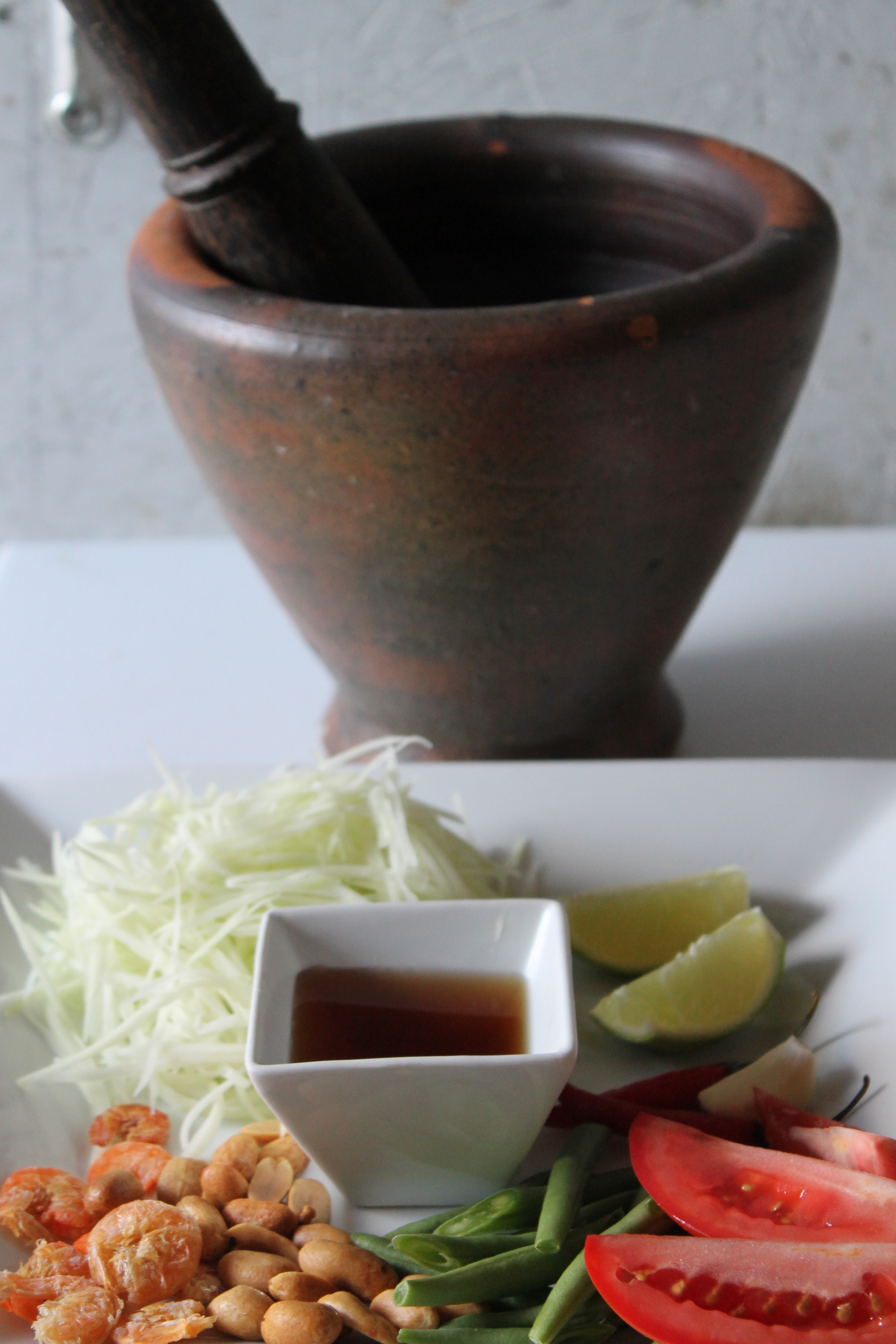 Wooden mortar & pestle with ingredients for som tam